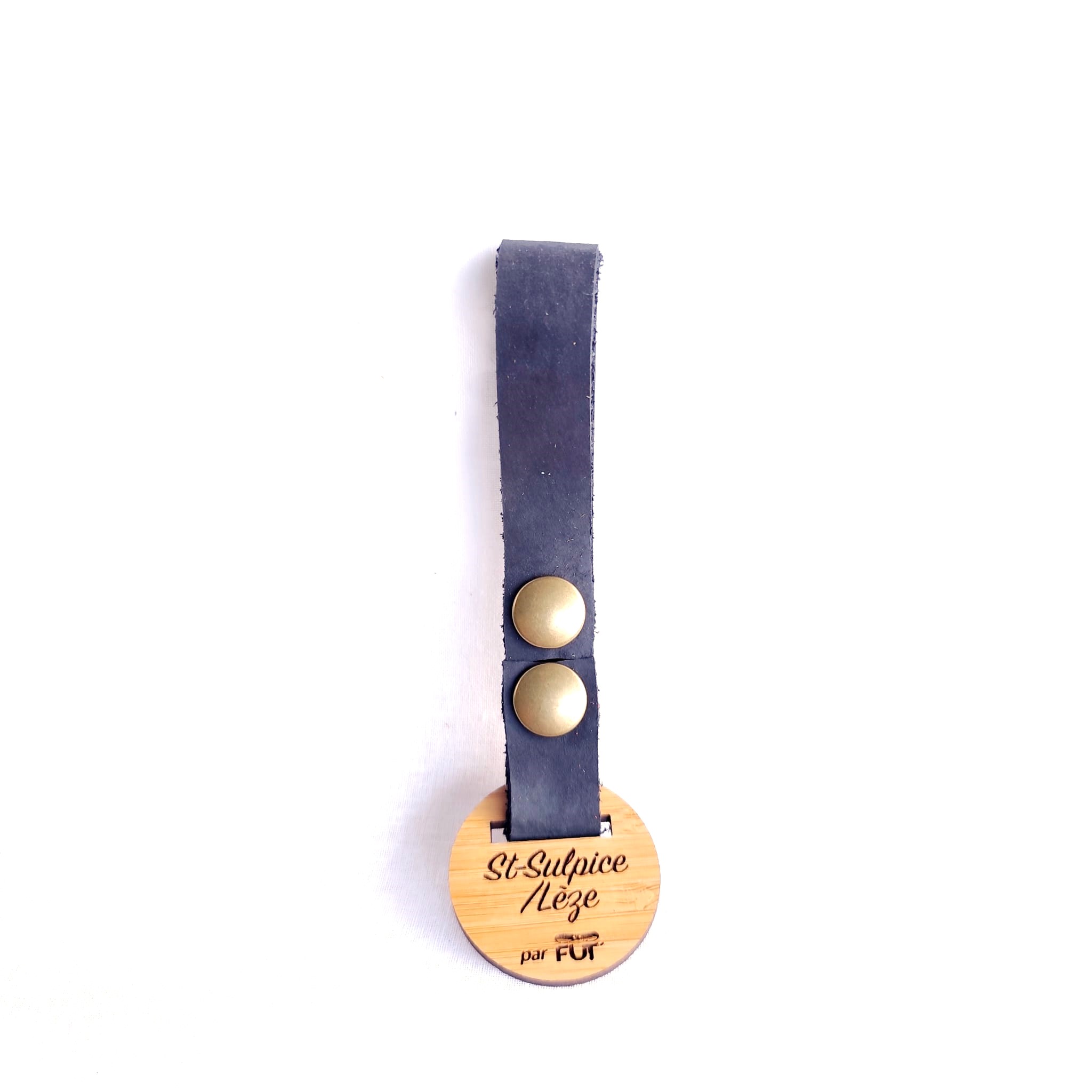 Attache porte-clés en cuir noir avec personnalisation sur rond en bambou gravé « Saint-sulpice sur Lèze ».