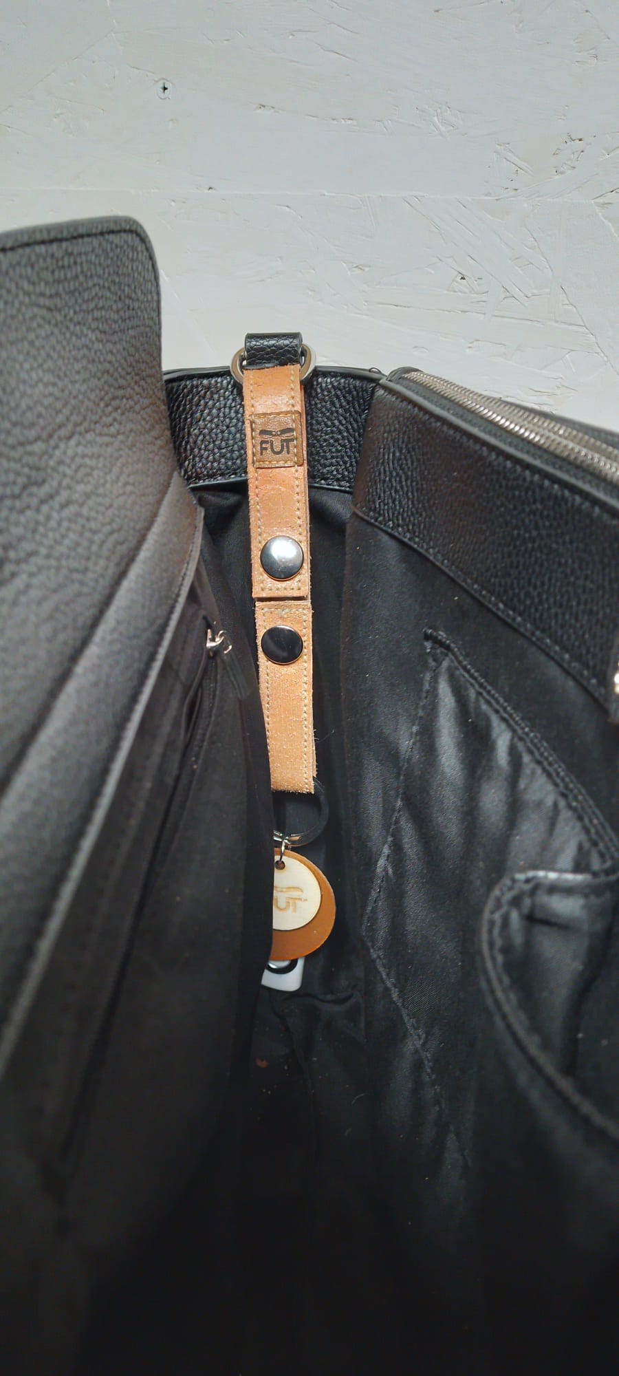 Attache porte-clés en cuir conçu pour réunir un ou plusieurs trousseaux de clés et les suspendre sur un sac à main, une ceinture, un sac de sport ou tout autre support équipé d’une sangle ou d’une boucle.