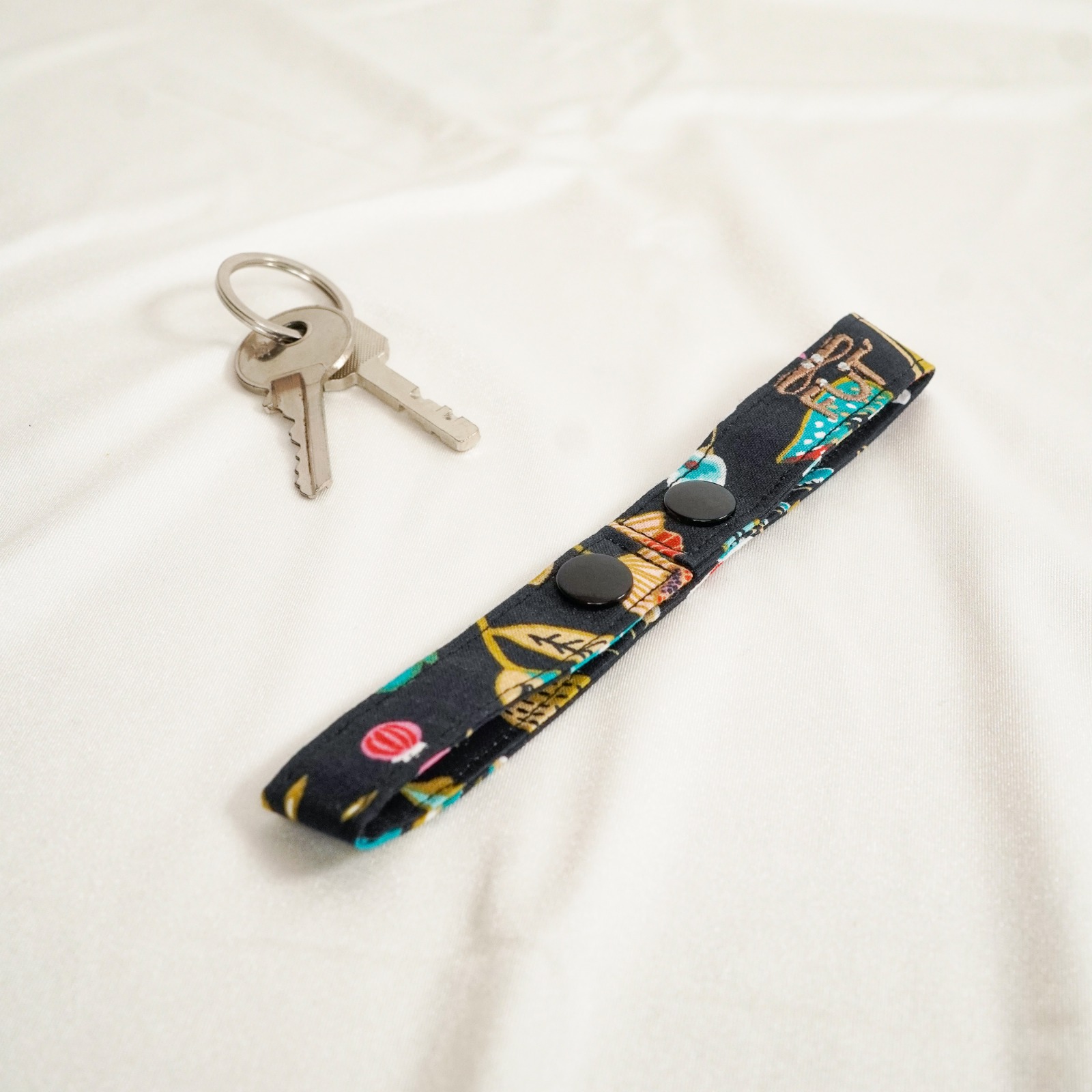 Attache porte-clés tissu conçu pour réunir un ou plusieurs trousseaux de clés et les suspendre sur un sac à main, une ceinture, un sac de sport ou tout autre support équipé d’une sangle ou d’une boucle.